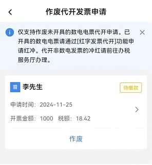 代开蓝字发票申请提交成功后,如果尚未开具数电发票和缴款,可以通过【我要办税】-【发票使用】-【作废代开发票申请】功能作废。