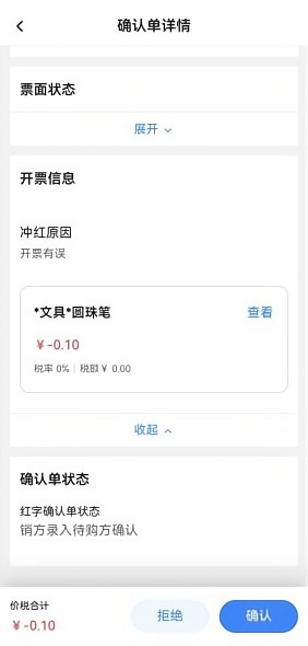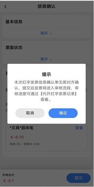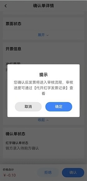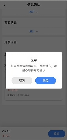 另外,申请红冲后,如果购买方尚未确认,可以通过【我要办税】-【发票使用】-【红字发票代开】-【代开红字信息确认单处理】进行撤销。购买方确认后则无法撤销此次红冲。