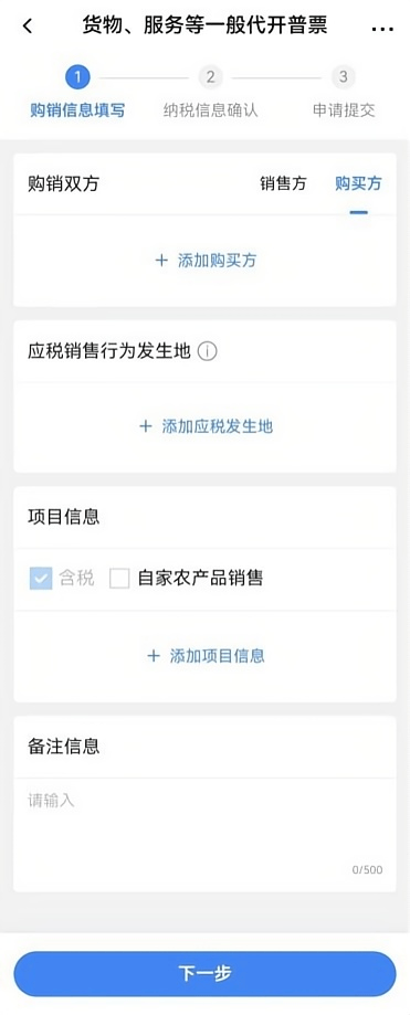 (1)点击“+添加购买方”填写购买方信息。如果是开票给自然人需要勾选对应选项;如果是开票给企业,需要正确填写企业名称,点击保存时会触发模糊搜索,选择带出的企业并点击“确认”按钮。填写完毕后点击保存。