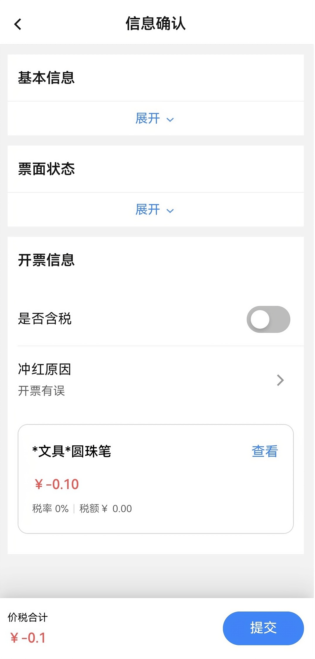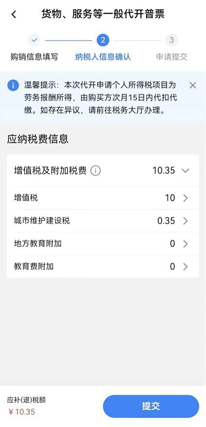 系统根据上一步纳税人填写的开票信息,自动计算应缴纳的税款。确认无误后,点击“提交”按钮。